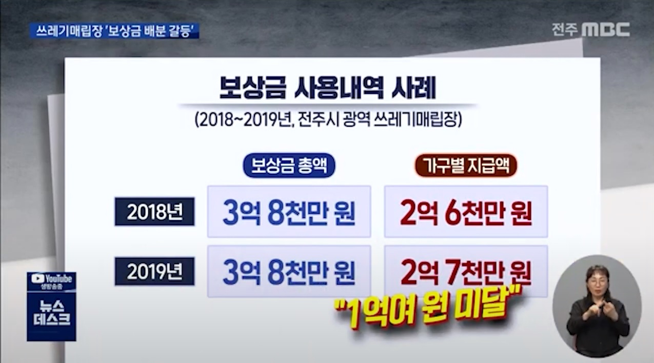 그런데 대부분의 주민들에게 동의를 받아 문제가 없다는 해명과 현실은 다릅니다. 주민들끼리도 갈등이 일어나고 있는 사안이기 때문입니다. 지난 6월 1일 전주MBC는 “전주권매립장정상화추진위원회는 주민들에게 전달되어야 할 나머지 1억여 원이 주민지원협의체 위원장의 사적인 용도로 사용됐다고 주장한다.”라고 보도했습니다. 당시 매립장 주민지원협의체 위원장은 사적으로 썼다는 의혹을 모두 부인하고, 2천만 원으로는 협의체 운영비가 부족하다는 해명을 반복했습니다.