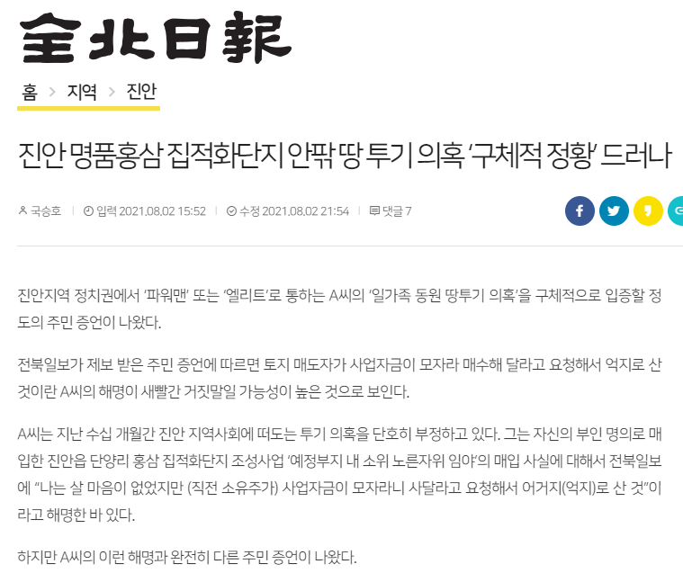전북일보는 진안 홍삼집적화단지 조성 과정에서 더불어민주당 전북도당 부위원장 출신의 인물이 가족을 동원해 단지 예정 부지에 부동산 투기를 했다는 의혹을 보도했습니다. 사업이 가시화된 2016년 11월 이후 일가족이 관련 땅을 집중 매입했다는 것입니다.