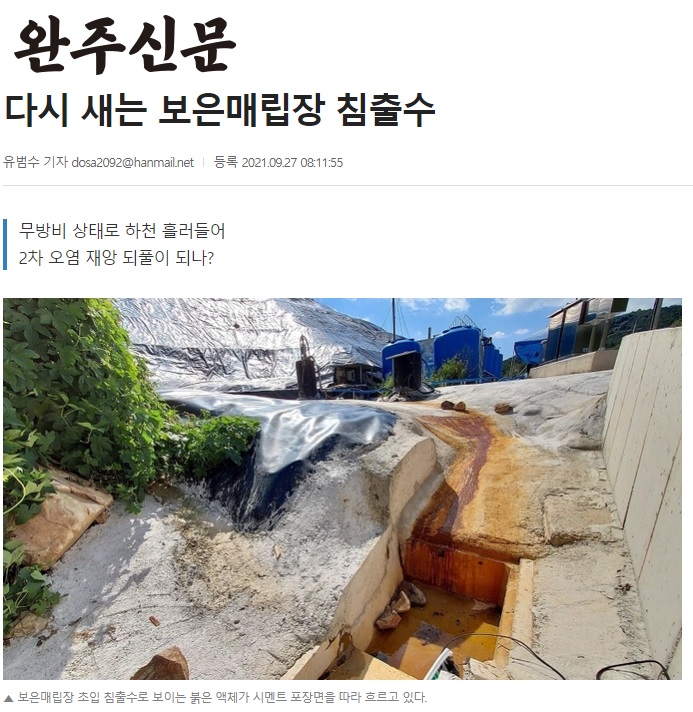[완주신문] 다시 새는 보은매립장 침출수(9/27, 유범수)