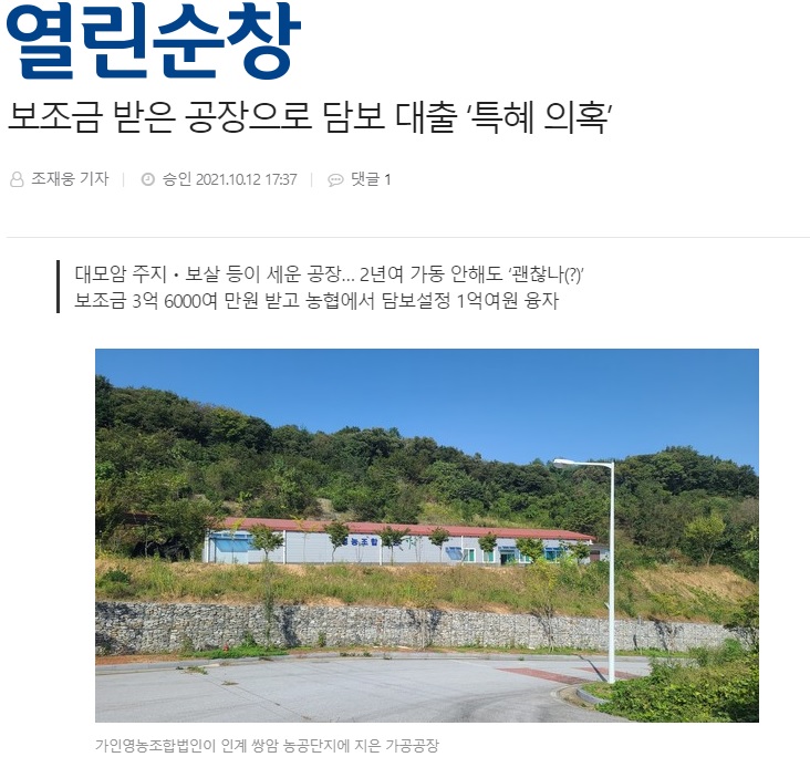 열린순창은 10월 13일 후속 보도에서 역시 대모암 주지 스님과 보살이 관련되어 있는 가인영농조합법인이라는 곳에 주목했습니다. 해당 법인은 2016년 시·군특화품목 육성지원사업 보조금 3억 6000만 원을 받아 2018년 3월 5일 인계 쌍암농공단지에 공장을 준공했습니다. 그런데 준공 2개월 만에 공장을 담보로 농협에서 1억 원의 대출을 받았습니다.