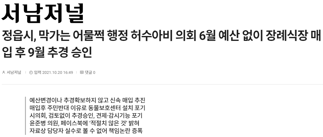 이후 10월 20일 “정읍시가 6월 매입한 예산을 9월 2차 추경에 뒤늦게 편성해 잘못된 예산 집행이었음이 드러났다.”라고 보도했습니다. 예산도 확보하지 않은 채 정읍시가 건물부터 매입했다는 것입니다. 서남저널은 “추경 예산 심의 과정에서 일체의 질의나 반대 의견 없이 일사천리로 예산이 통과되었다.”라며, 정읍시의회를 견제·감시 기능을 포기한 ‘허수아비’라고 강하게 비판했습니다.