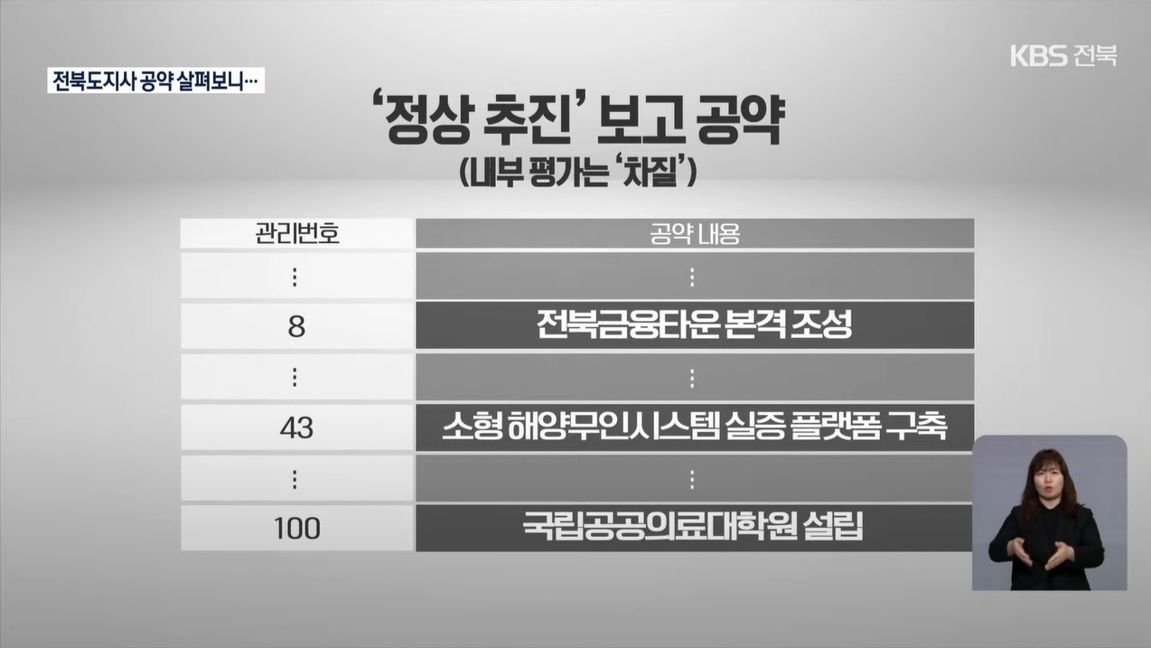 KBS전주총국은 “전라북도가 홈페이지에 공개한 공약 이행률은 73.3%지만, 지난달 말 전라북도가 작성한 내부 자료에는 공약 이행률을 57.4%로 기록했다.”라고 지적했습니다.