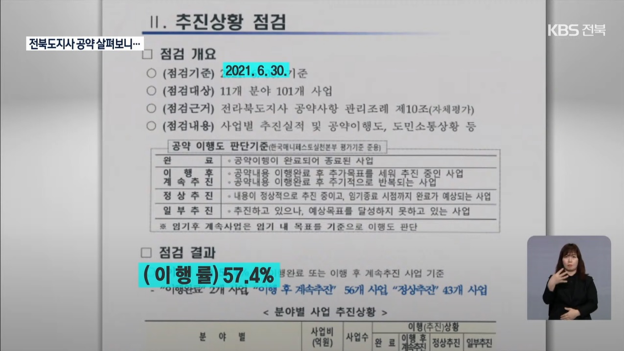 KBS전주총국은 “전라북도가 홈페이지에 공개한 공약 이행률은 73.3%지만, 지난달 말 전라북도가 작성한 내부 자료에는 공약 이행률을 57.4%로 기록했다.”라고 지적했습니다.