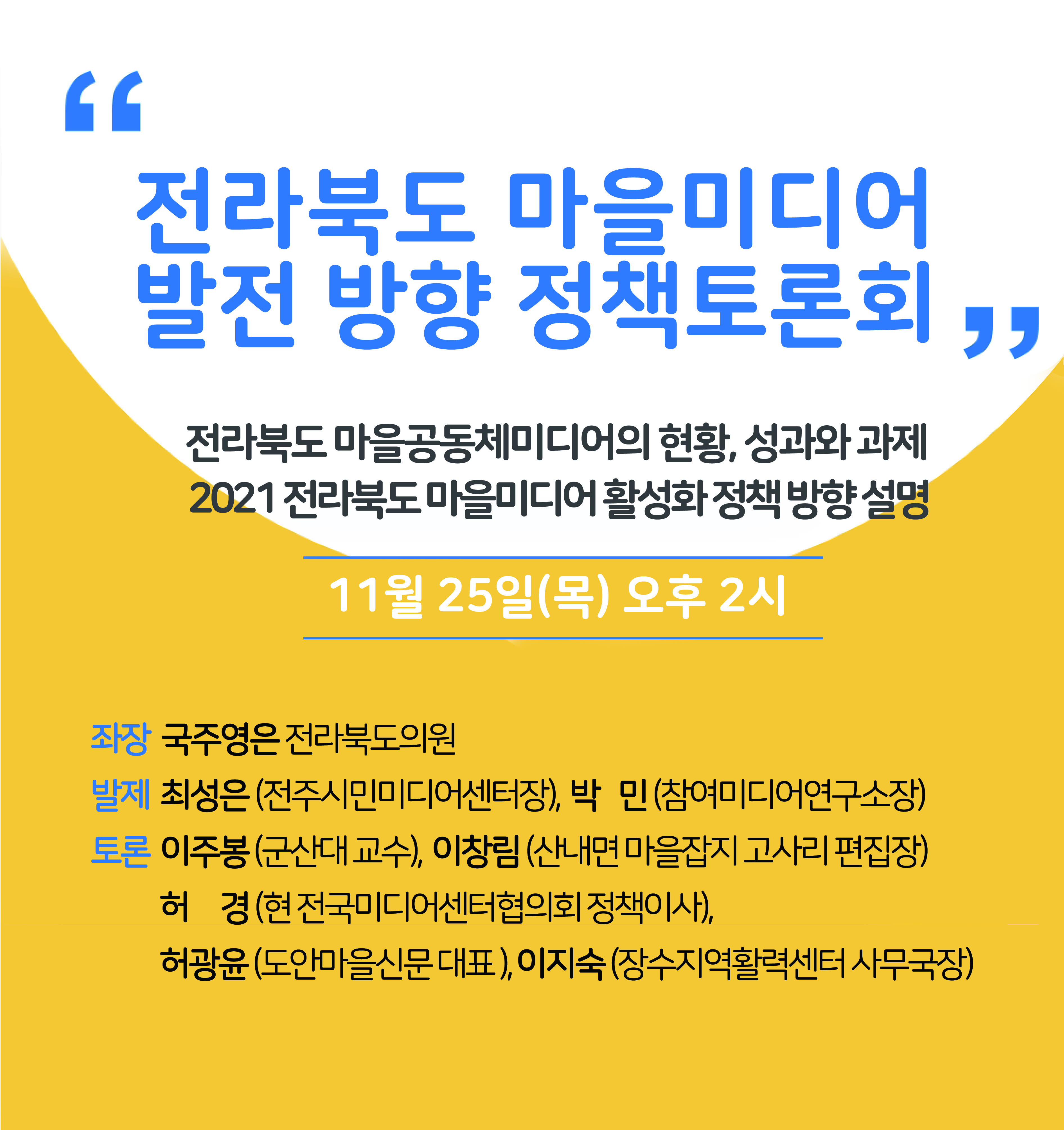 | 2021 전라북도 마을공동체미디어 발전 방향 정책 토론회 (2021/11/25) (0) | 2021.11.15 |