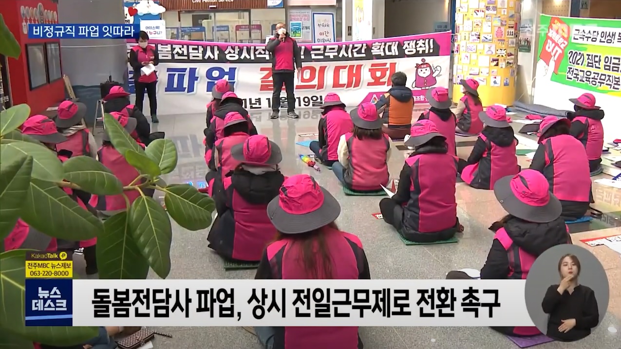전북 지역의 학교 돌봄 노동자들이 19일부터 무기한 총파업을 진행하고 있습니다. 4시간으로 정해진 노동 시간에 비해 업무가 너무 많아 일할 시간을 늘려달라는 것입니다. 그런데 돌봄을 확대하겠다는 교육부의 입장에 전북교육청은 반대하는 입장을 보였습니다. 전체 직원의 4분의 1이 비정규직 노동자인만큼 전북교육청의 적극적인 협의가 필요해 보입니다.