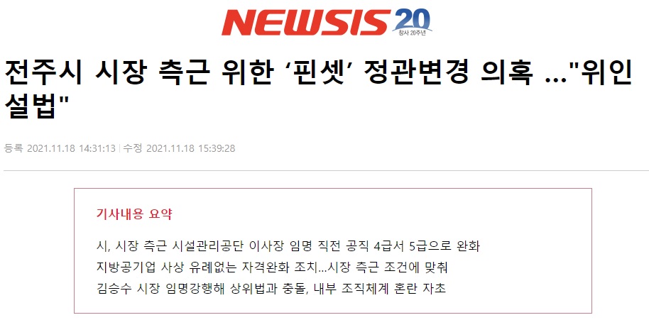 [뉴시스] 전주시 시장 측근 위한 ‘핀셋’ 정관변경 의혹 …"위인설법"(11/18, 심회무)