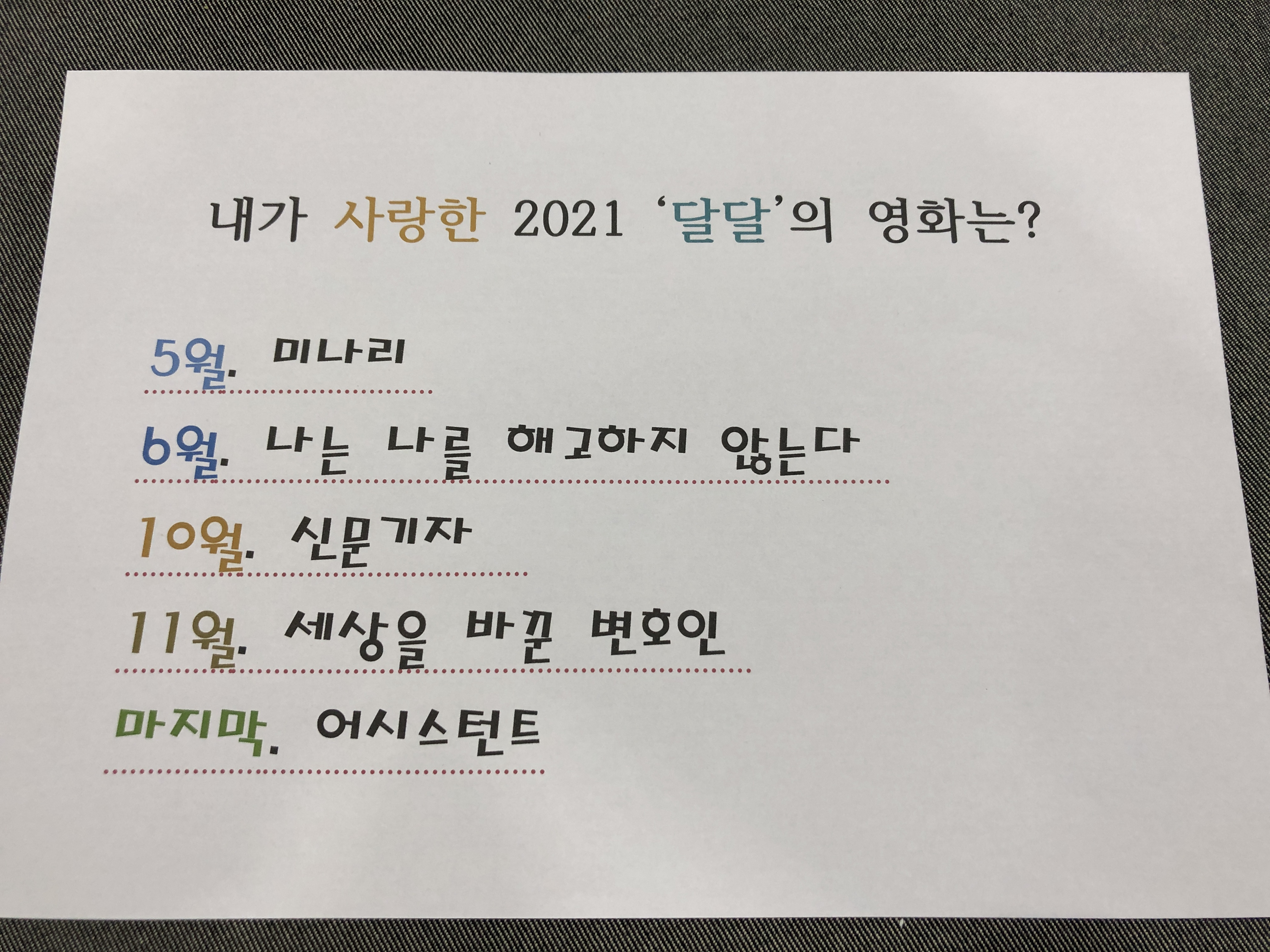 자주 만나지는 못했지만 2021년 달달의 활동을 모두 마쳤습니다. 여러분은 올해 영화 중 어떤 영화가 가장 기억에 남으셨나요? 주변 지인들과 영화를 보고 이야기 해보는 것도 새로운 즐거움이라고 생각합니다.