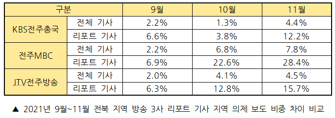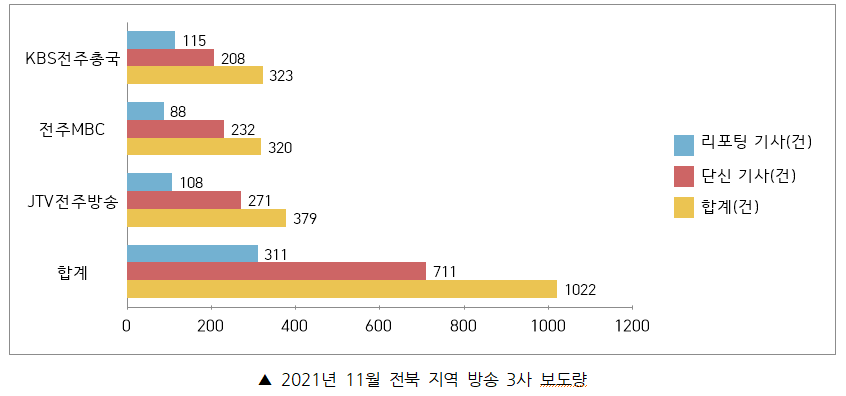 2021년 11월 전북 지역방송 3사 보도량은 리포트 기사 311개(30.4%), 단신 기사 711개(69.6%)로 총 1022건이다. 각 방송사별로 살펴보면 다음과 같다.