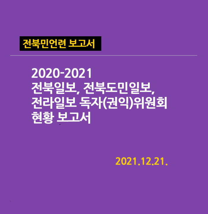 2021년 12월 문화체육관광부가 ABC협회 유료부수를 대체해 언론의 신뢰성을 정부 광고 집행 지표로 포함하는 새 정부광고 운영 체계를 확정함에 따라 언론사의 사회적 책임이 중요해졌다. 신뢰가 수익으로 연결될 수 있다는 방향성이 확정된 것으로 언론계에 던지는 의미가 적지 않은데 사회적 책임은 언론중재위원회 직권 조정(정정보도 등) 및 시정 권고 건수, 신문윤리위원회 및 광고자율심의기구 주의‧경고 건수, 개별 매체사의 편집위원회‧독자(권익)위원회 설치‧운영 여부 등 3개 분야로 구성됨에 따라, 각 언론사의 독자위원회 운영 실태에 대한 중요성은 더욱 높아진 상황이다. 이에 전북민언련에서는 2020년부터 2021년 현재까지 전북일보, 전북도민일보, 전라일보 독자(권익)위원회 운영 실태를 각 사에서 보도된 내용을 중심으로 분석했다.