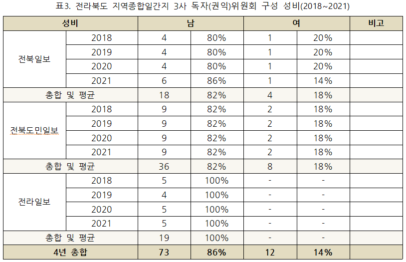 2018년부터 2021년까지 전라북도 지역 종합일간지 3사의 독자(권익)위원회의 4편 평균 성비 구성은 남성 86%, 여성 14%로 남성 위원의 비율이 매우 높았다.