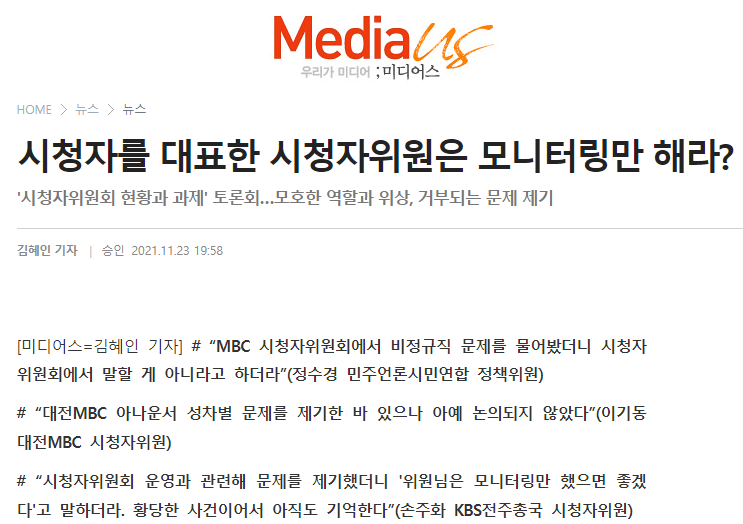 11월 23일 미디어오늘 보도에 따르면 토론회에 참여한 이명재 자유언론실천재단 기획편집위원(민언련 정책위원)은 독자권익위원회의 문제점으로 크게 다섯 가지를 꼽았습니다.