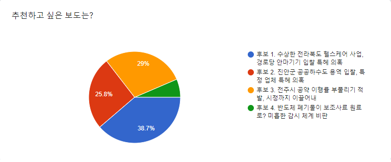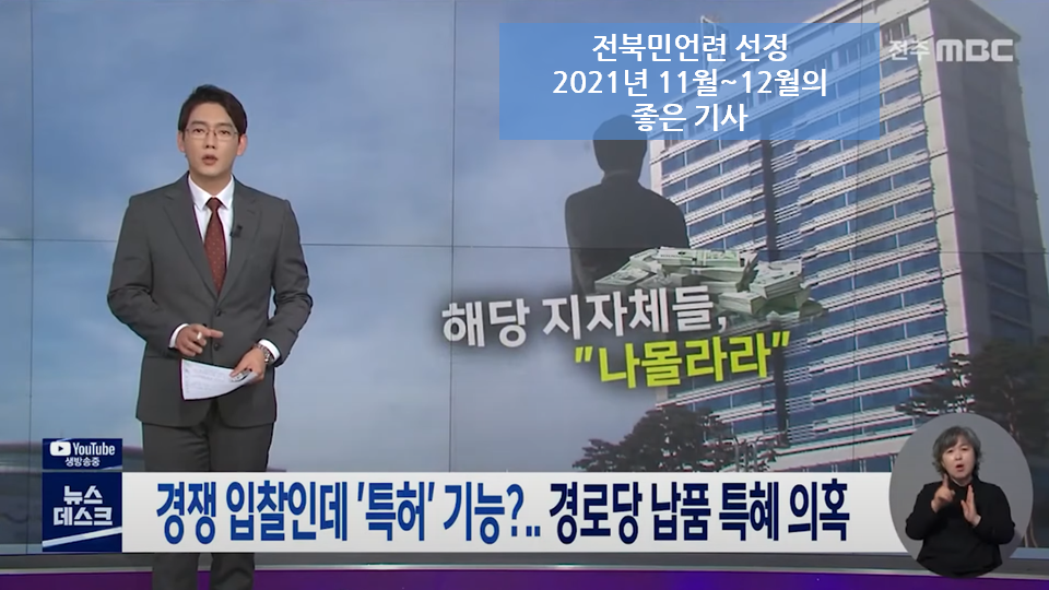두 개의 이달의 좋은 기사 후보 중 전주MBC 허현호 취재기자 / 서정희 촬영기자의 <수상한 전라북도 헬스케어 사업, 경로당 안마기기 입찰 특혜 의혹> 연속 보도가 38.7%의 투표를 받아 2021년 11~12월의 좋은 기사로 선정되었음을 밝힙니다.