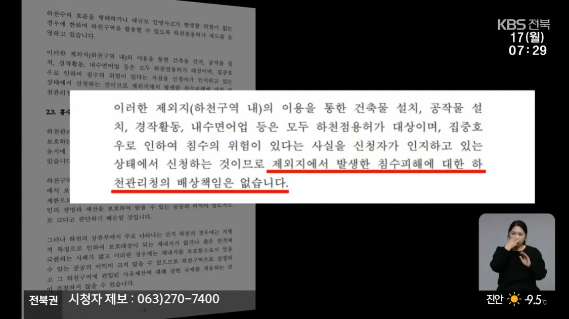 지난 6일 KBS전주총국은 “문제는 홍수관리 구역이나 하천관리 구역 지정 이전부터 농사를 짓거나 적법하게 건물을 지은 경우도 배상 대상에서 제외시켰다는 점이다. 해당 구역에 포함된 피해 건수는 300여 건.”이라고 보도했습니다.