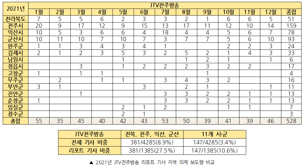 JTV전주방송의 경우 2021년 1년 동안 전주시 관련 리포트 기사가 159건으로 세 방송사를 통틀어 가장 많았고, 장수군 관련 리포트 기사가 3건으로 가장 적은 것으로 나타났다. 또한 2021년 7월부터 <신문 돋보기> 보도로 지역 풀뿌리 주간지와 마을신문, 대학신문 소식을 전달하는 보도를 시작하여, 7월부터 진안군과 순창군 관련 보도 건수가 눈에 띄게 증가하였다.