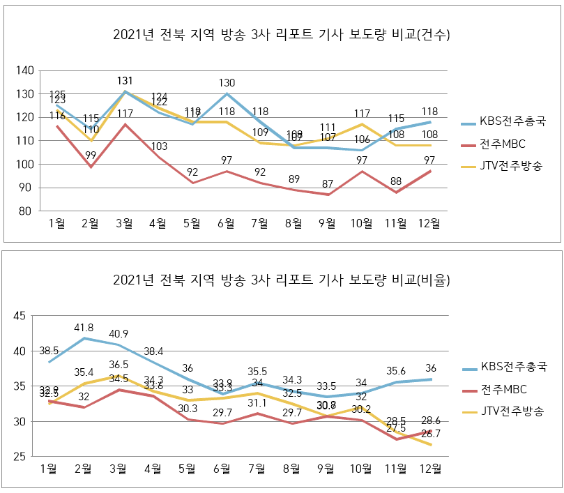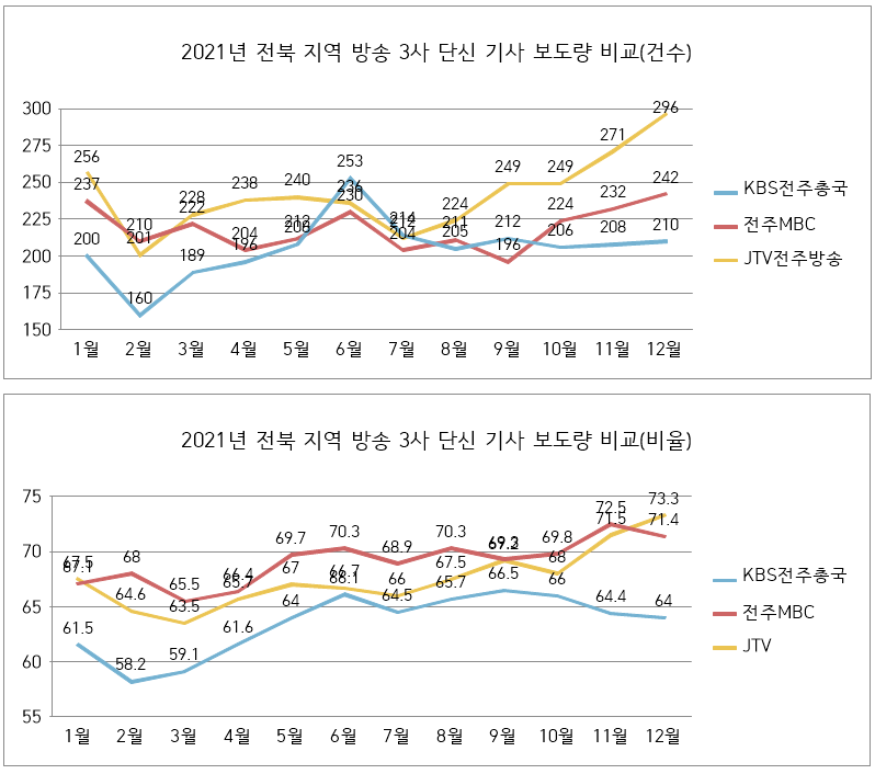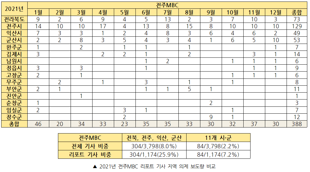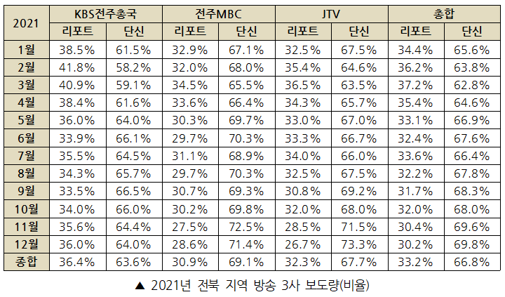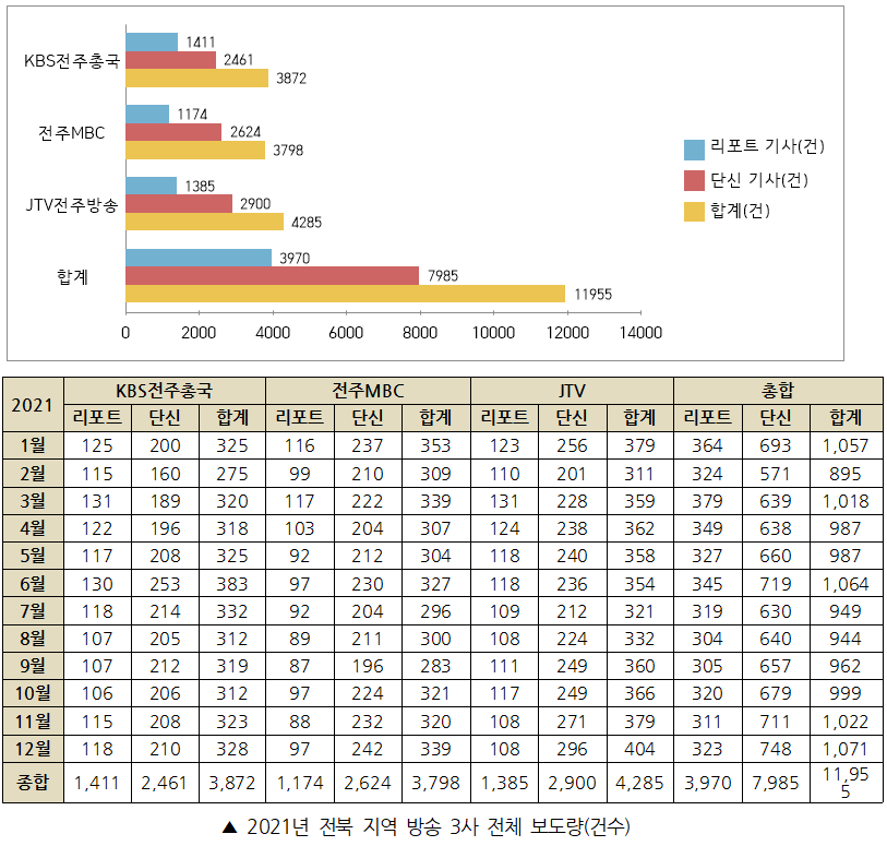 2021년 전북 지역방송 3사 보도량은 리포트 기사 3970개(33.2%), 단신 기사 7985개(66.8%)로 총 11955건이다. 각 방송사별로 살펴보면 다음과 같다.