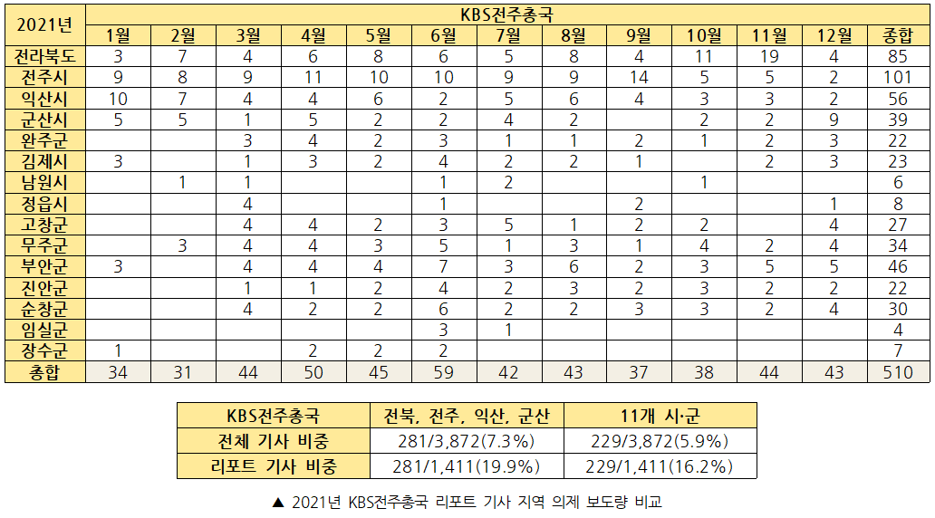 KBS전주총국의 경우 2021년 1년 동안 전주시 관련 리포트 기사가 101건으로 가장 많았고, 임실군 관련 리포트 기사가 4건으로 가장 적은 것으로 나타났다. 2021년 3월부터 시작한 <풀뿌리K> 보도의 영향으로 3월부터 전체적인 지역별 보도 건수가 크게 증가했다. 그러나 <풀뿌리K> 보도 대상에 포함되지 않은 지역들(남원, 정읍, 임실, 장수)에 대한 보도 건수는 전부 한 자릿수를 기록하면서, 다른 지역 보도 건수와 큰 차이를 보였다.