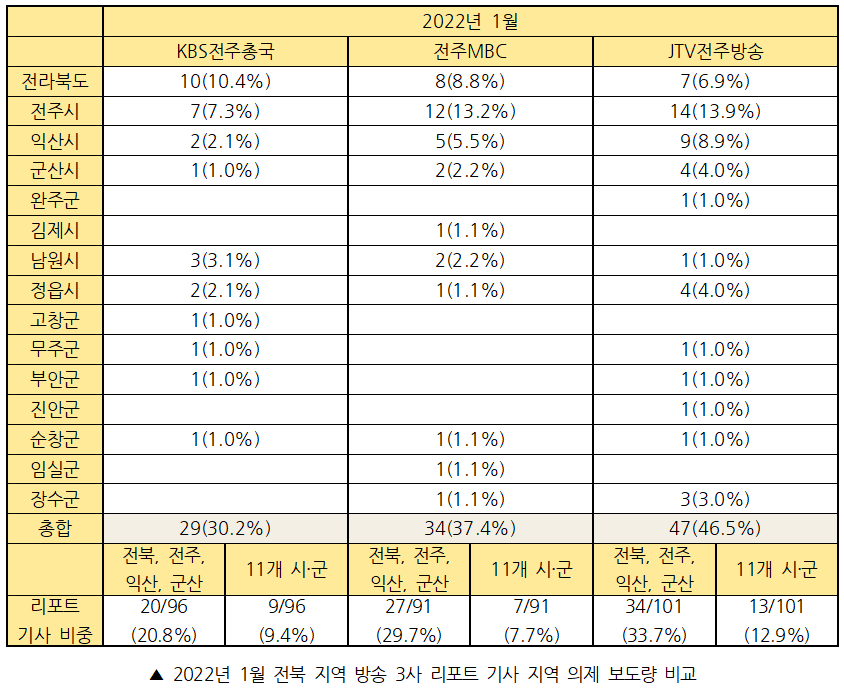 2022년 1월 전북 지역 방송 3사의 지역별 리포트 기사 보도량을 살펴본 결과 JTV전주방송 47건(46.5%), 전주MBC 34건(37.4%), KBS전주총국 29건(30.2%) 순으로 나타났다.