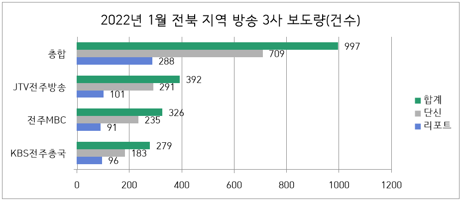2022년 1월 전북 지역방송 3사 보도량은 리포트 기사 288개(28.9%), 단신 기사 709개(71.1%)로 총 997건이다. 각 방송사별로 살펴보면 다음과 같다.