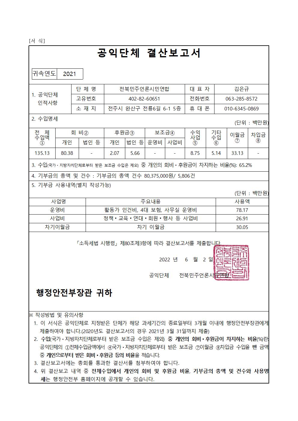 전북민언련 2021년 회계 결산 세부 내용