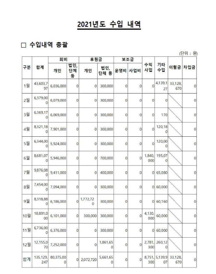 | 후원금 | 2,072,720 | 개인후원(특별 후원금) | |