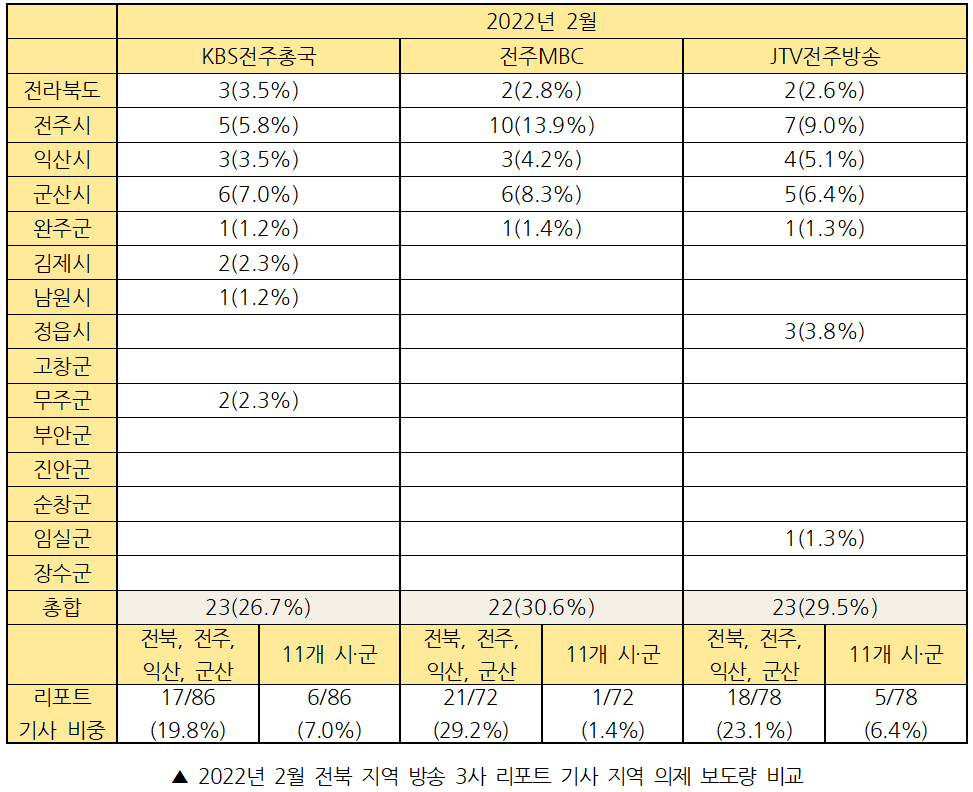 2022년 2월 전북 지역 방송 3사의 리포트 기사 지역 의제 보도량 비율을 살펴본 결과 전주MBC 30.6%(22건), JTV전주방송 29.5%(23건), KBS전주총국 26.7%(23건) 순으로 나타났다.