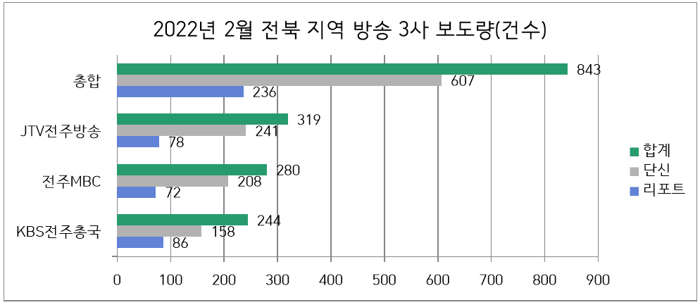 2022년 2월 전북 지역방송 3사 보도량은 리포트 기사 236개(28.0%), 단신 기사 607개(72.0%)로 총 843건이다. 각 방송사별로 살펴보면 다음과 같다.