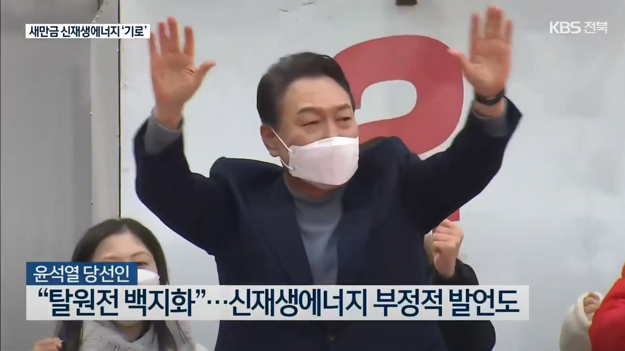 15일 KBS전주총국 또한 “갈림길에 선 새만금 재생에너지”라고 표현하면서, “탈원전 백지화가 신재생에너지 정책 폐기와 같은 뜻은 아니지만, 윤석열 당선인은 신재생에너지에 부정적 시각을 숨기지 않았다.”라고 보도했습니다. 실제로 윤석열 당선인의 새만금 관련 공약에 신재생에너지에 대한 내용이 없다는 점을 근거로 들었습니다.