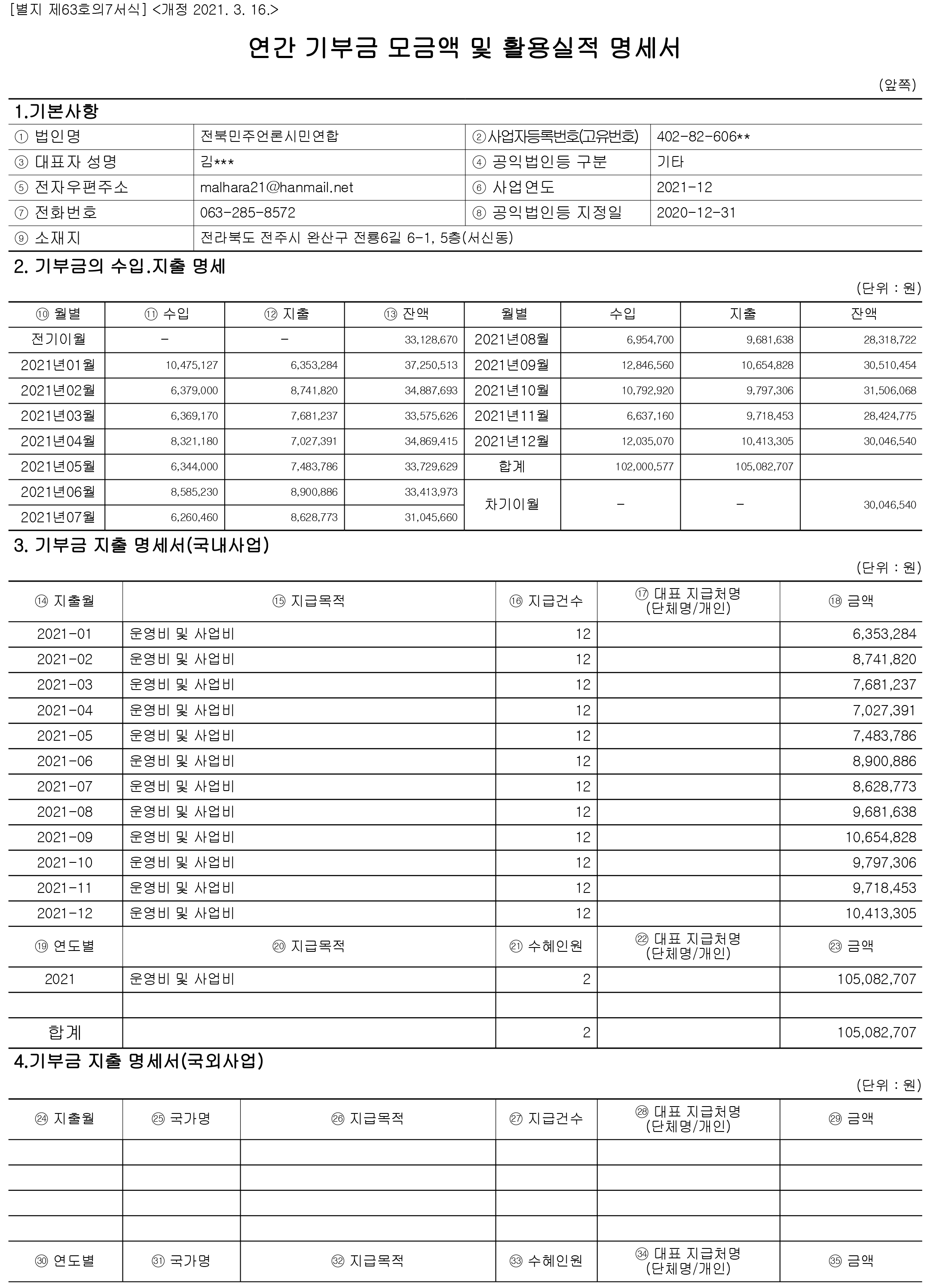 2021년 기부금 모금액 및 활용실적 명세서