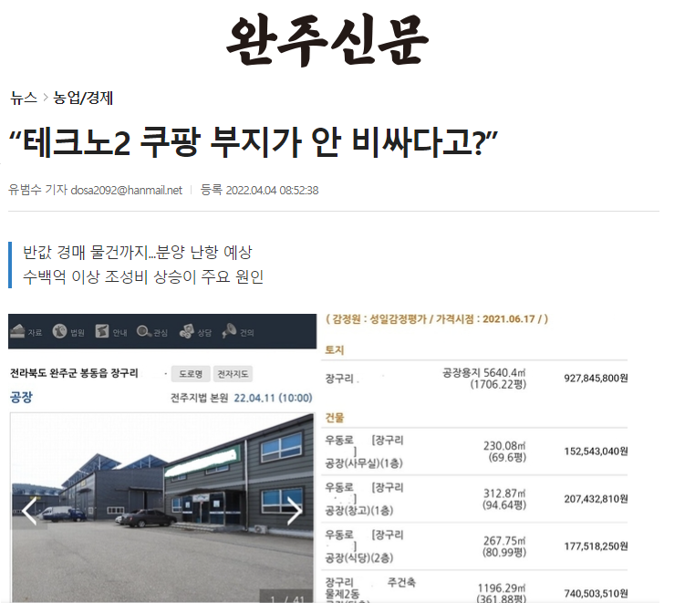 [완주신문] “테크노2 쿠팡 부지가 안 비싸다고?”(4/4, 유범수)