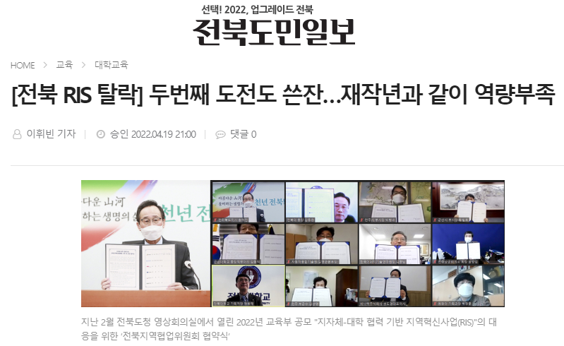 [전북도민일보] 전북도-전북대 RIS사업 탈락 ‘누구 책임인가’(4/20, 2면, 이휘빈)