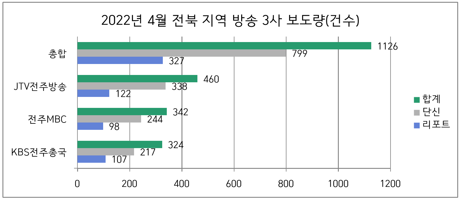 2022년 4월 전북 지역방송 3사 보도량은 리포트 기사 327개(29.0%), 단신 기사 799개(71.0%)로 총 1126건이다. 각 방송사별로 살펴보면 다음과 같다.