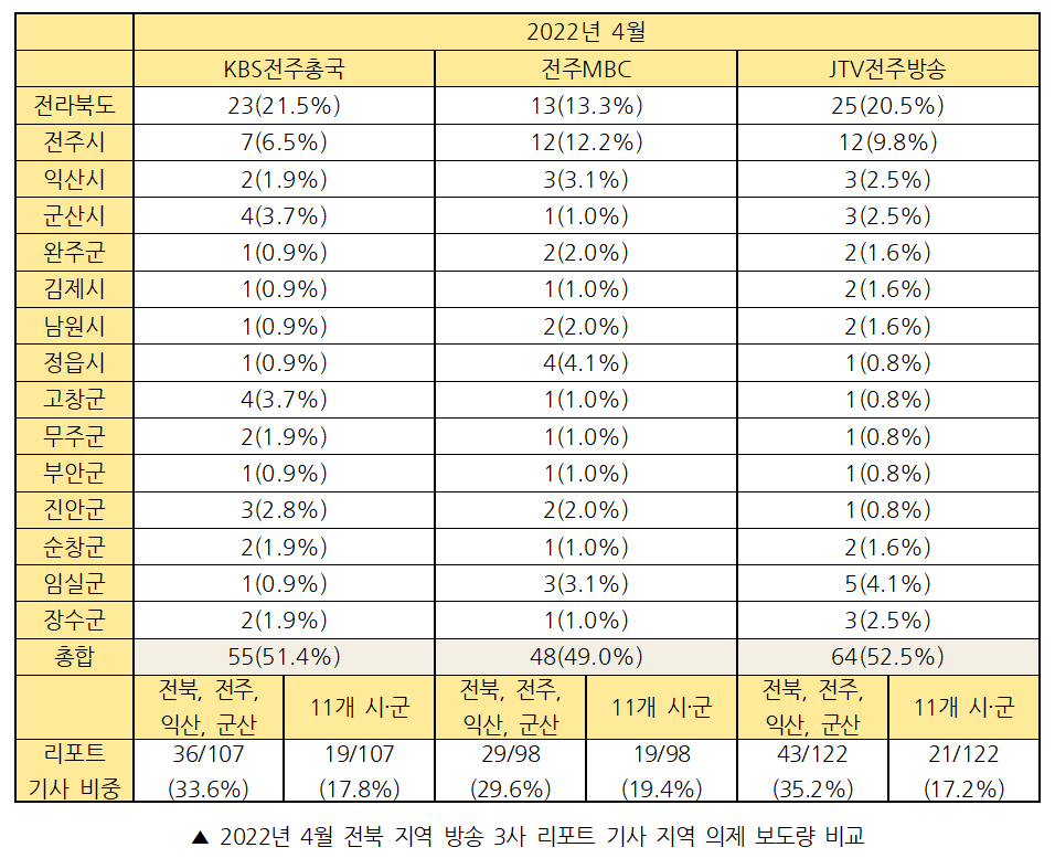 2022년 4월 전북 지역 방송 3사의 리포트 기사 지역 의제 보도량 비율을 살펴본 결과 JTV전주방송 52.5%(64건), KBS전주총국 51.4%(55건), 전주MBC 49.0%(48건) 순으로 나타났다.
