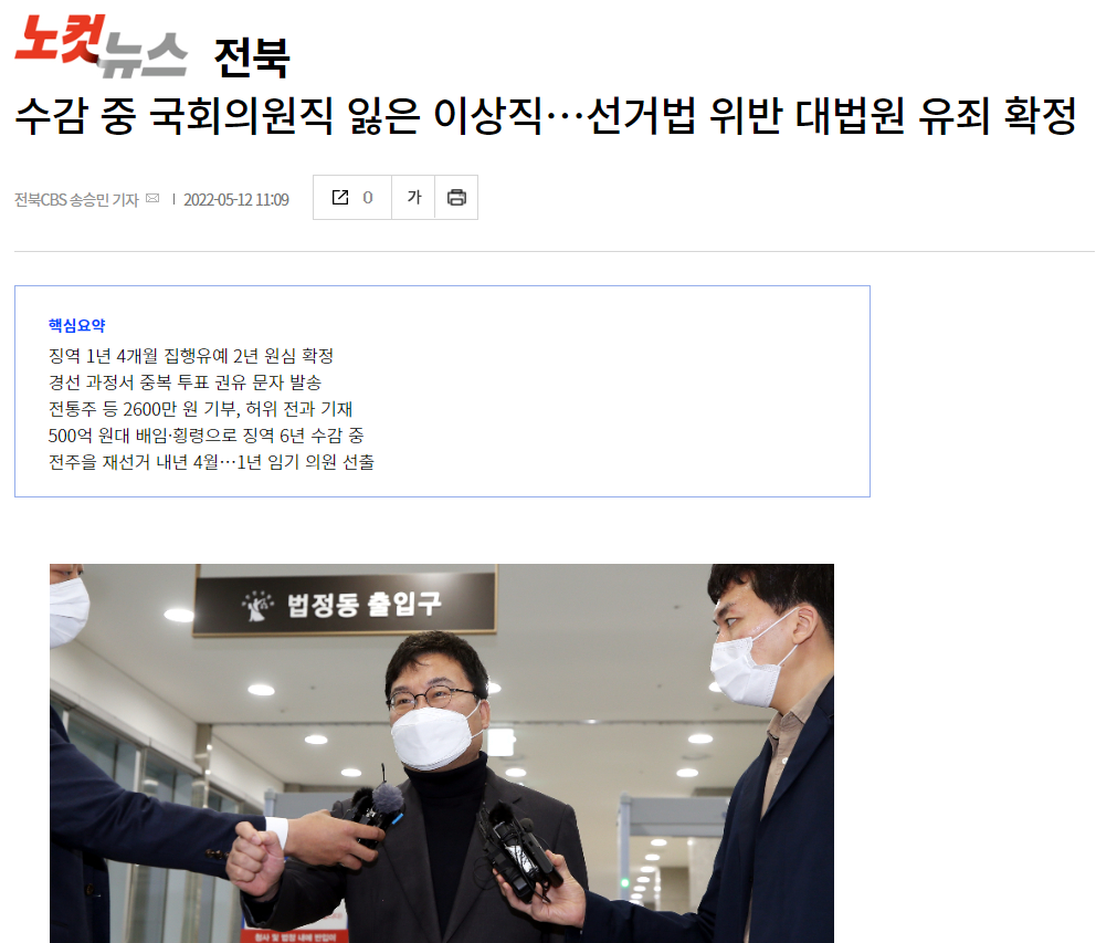 [전북도민일보] ‘선거법 위반’ 이상직국회의원직 상실…집행유예 확정(5/12, 장수인)