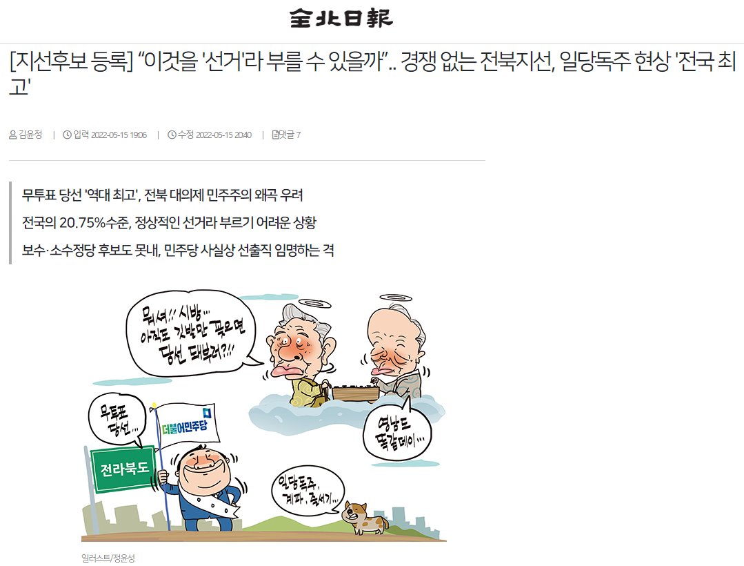 오늘 자 전라일보와 15일 전북의소리는 이번에야말로 심도 깊은 개선논의가 필요하다며 단독 출마자에 대한 찬반 투표 도입 등 무투표 당선의 문제점을 막기 위한 선거 제도 변화가 필요하다고 주장했습니다. 특히 전북의소리는 “‘민주주의 꽃’이라고 여겨왔던 선거 제도가 큰 위기에 직면했다. 이는 곧 ‘민주주의의 위기’라는 지적”이라고 보도했는데요, 선거 후에 또 이런 문제가 흐지부지되진 않을지 걱정입니다.