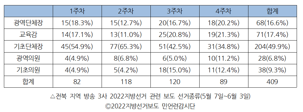 전북 지역 방송 3사가 2022지방선거 보도에서 다룬 각 선거는 기초단체장 선거가 31건(34.8%)으로 가장 많았다. 이어 교육감 19건(21.3%), 광역단체장 18건(20.2%), 기초의원 11건(12.4%), 광역의원 10건(11.2%) 순으로 나타났다.