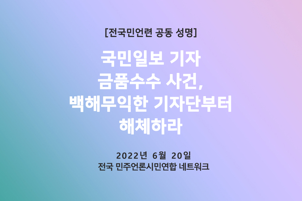 | [전국민언련네트워크 공동 성명] 범죄전력·토호유착 서창훈 회장, 신문윤리위원회 이사장 당장 사퇴하라! (20220811) (0) | 2022.08.11 |