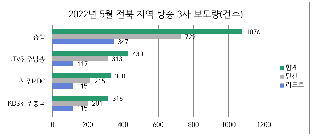 2022년 5월 전북 지역방송 3사 보도량은 리포트 기사 347개(32.2%), 단신 기사 729개(67.8%)로 총 1076건이다. 각 방송사별로 살펴보면 다음과 같다.
