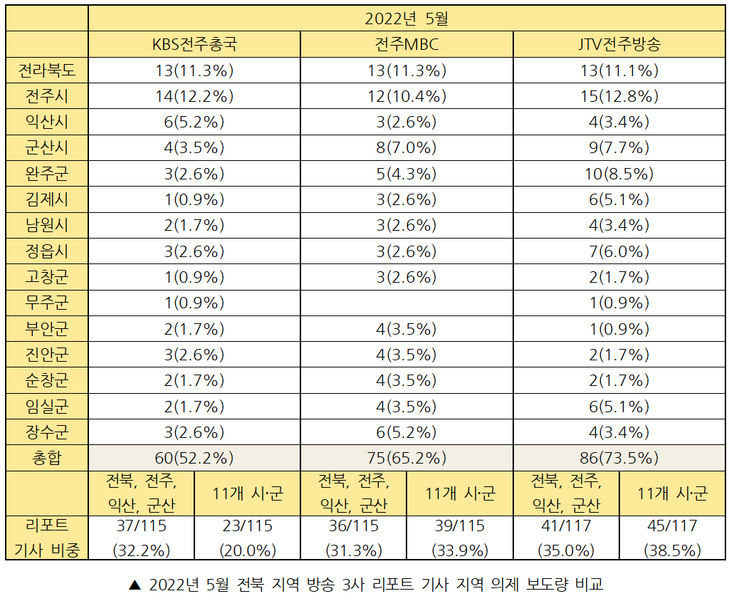 2022년 5월 전북 지역 방송 3사의 리포트 기사 지역 의제 보도량 비율을 살펴본 결과 JTV전주방송 73.5%(86건), 전주MBC 65.2%(75건), KBS전주총국 52.2%(60건) 순으로 나타났다.