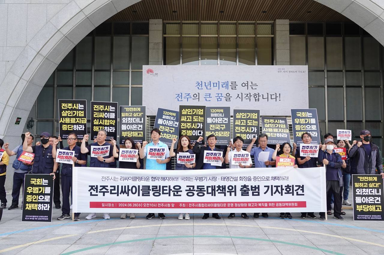 전주시에서 발생한 음식물 및 재활용 폐기물을 처리하는 시설인 종합리싸이클링타운의 운영 파행이 반 년을 지나고 있다. 전주시민의 재산이지만 그 운영은 민간기업에게 맡겨져 있는 전주리싸이클링타운은 민간투자사업이 갖는 문제들의 백과사전 격이다. 민간기업은 시민의 재산으로 음폐수를 무단 반입하여 자신들의 배를 채우기 바빴고, 이를 문제 삼고 노동자의 권리를 요구한 조합원들은 해고하고 나섰다. 경험 없는 운영사가 운영을 맡으며 사고는 빈번했으며 결국 폭발 재해로 노동자들이 사경을 헤매고 있으며 그 중 1명은 목숨을 잃었다.