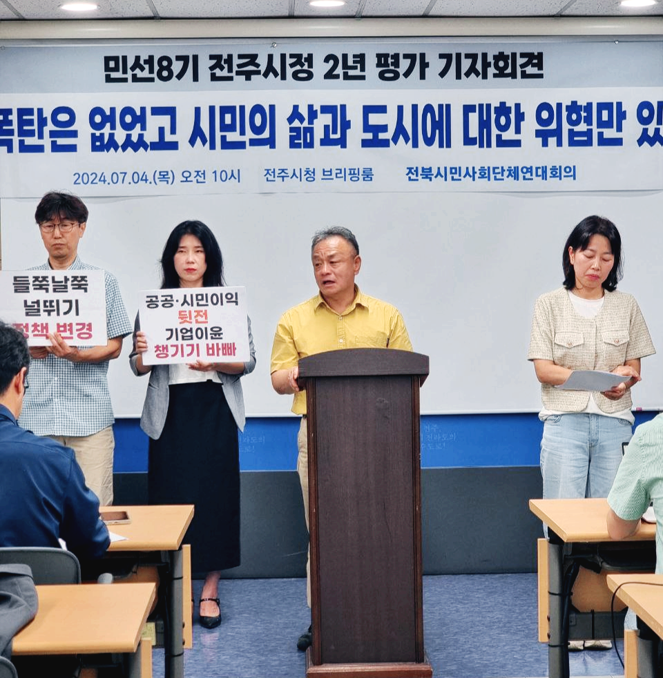 우리 전북지역 시민사회는 민선8기 전주시정 2년을 평가하고 남은 2년 전주 발전의 올바른 방향을 함께 모색할 것을 제안하기 위해 오늘 기자회견을 진행한다.
