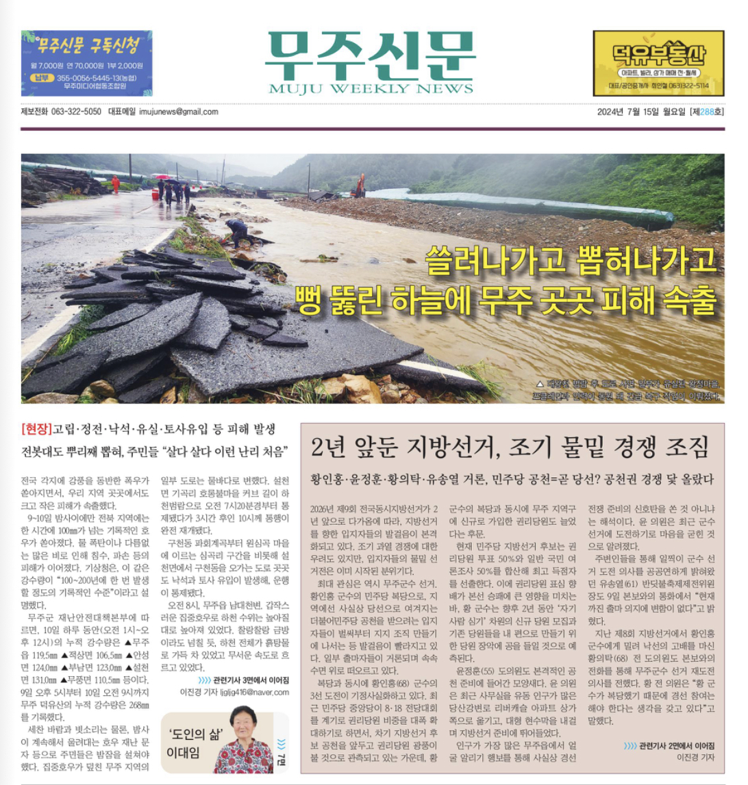지난 7월 9일과 10일 사이 무주에도 많은 비가 내려 피해가 발생했습니다. 7월 15일 무주신문은 무주군 곳곳에서 발생한 피해 상황을 보도한 데 이어 7월 22일에는 무주군내 산사태 취약지역 관리 실태를 취재해 보도했습니다.