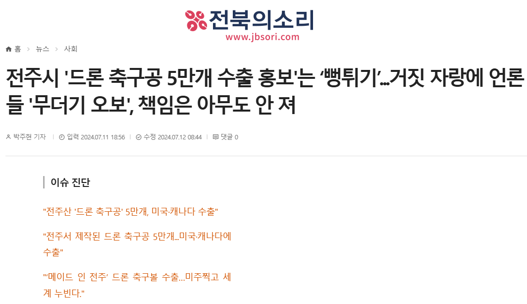 1. 전주시 '드론 축구공 5만개 수출 홍보'는 ‘뻥튀기’...거짓 자랑에 언론들 '무더기 오보', 책임은 아무도 안 져(7/11, 박주현 취재기자)