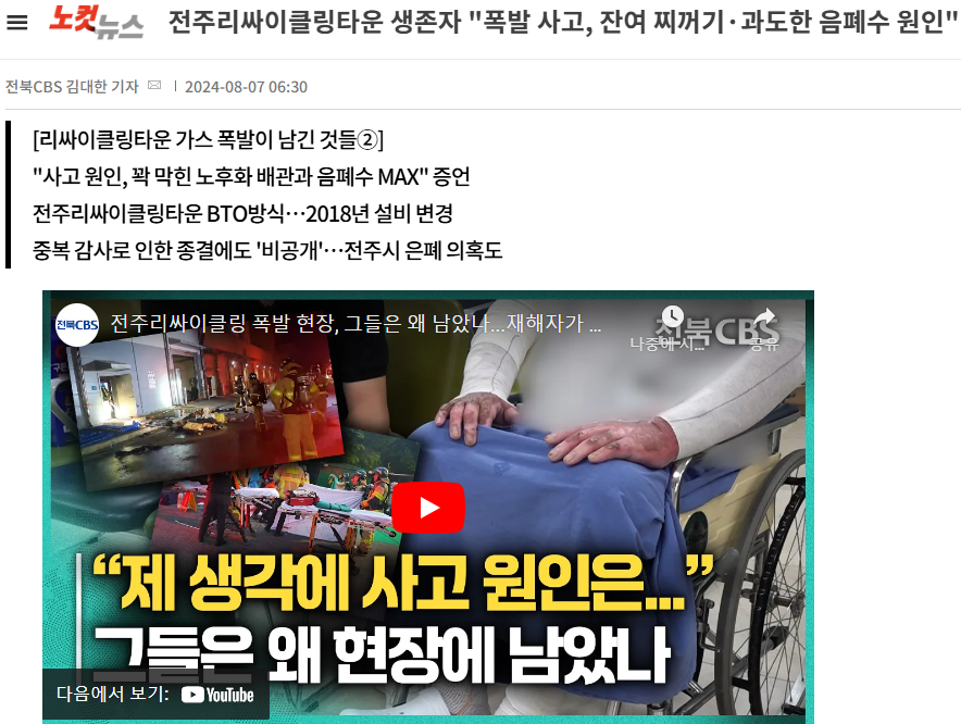 [노컷뉴스전북] 전주리싸이클링타운 생존자 "폭발 사고, 잔여 찌꺼기·과도한 음폐수 원인"(8/7, 김대한)