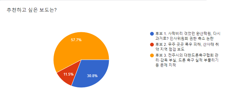 세 개의 후보 중 <전주시의 드론축구공 수출 계약 부풀리기 및 언론의 무더기 오보에 대한 문제제기까지> 전북의소리 보도가 57.7%의 투표를 받아 2024년 7월의 좋은 기사로 선정되었습니다. 축하드립니다.
