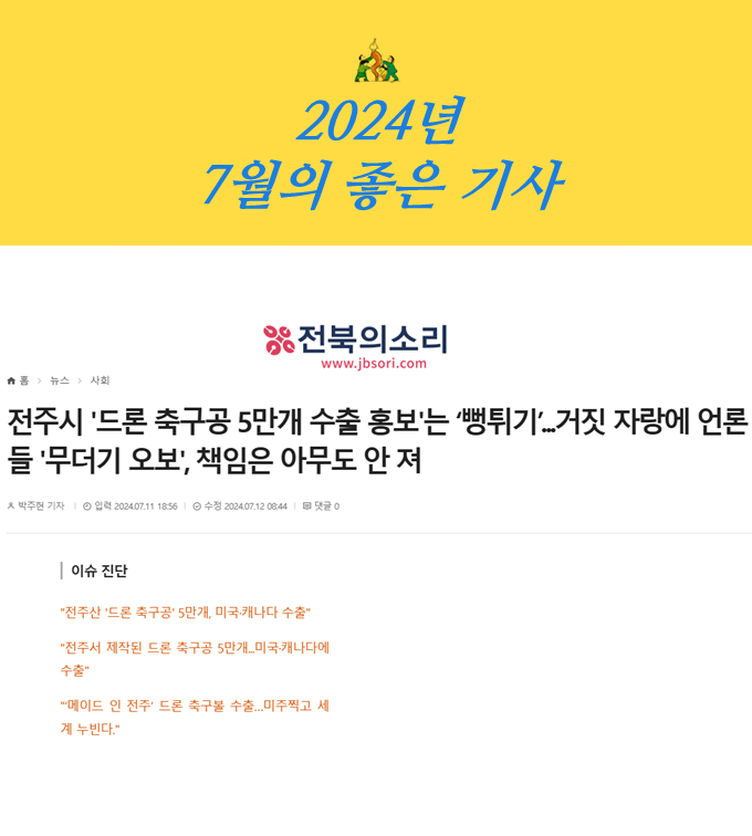 1. 전주시 '드론 축구공 5만개 수출 홍보'는 ‘뻥튀기’...거짓 자랑에 언론들 '무더기 오보', 책임은 아무도 안 져(7/11, 박주현 취재기자)