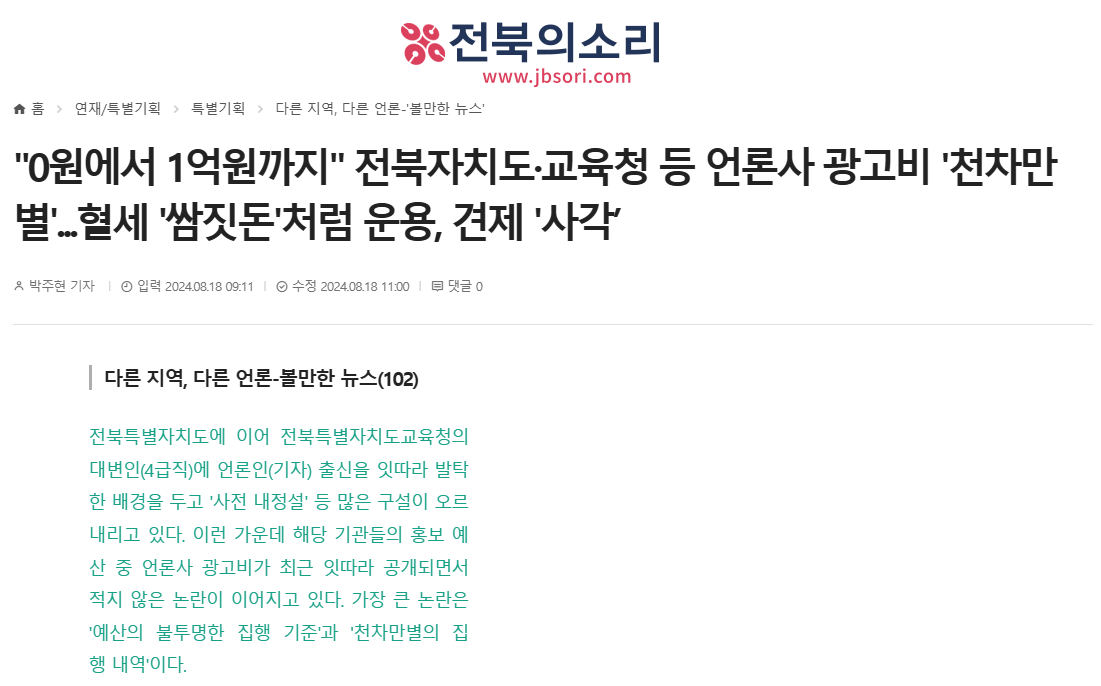 [전북의소리] "0원에서 1억원까지" 전북자치도·교육청 등 언론사 광고비 '천차만별'...혈세 '쌈짓돈'처럼 운용, 견제 '사각’(8/18, 박주현)