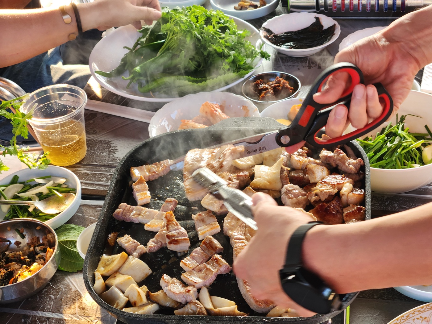 저녁 식사는 에코타운에 있는 모정에서 삼겹살을 먹었습니다. 회원님들이 나눔해주신 반찬으로 자리가 더 풍성해졌어요.