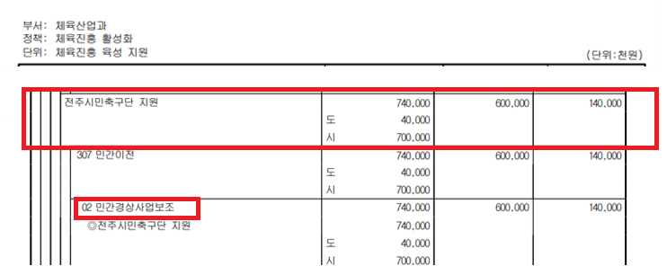 전주시의 예산 지원도 이어졌습니다. 전주시 결산 현황을 살펴보면 2013년도에는 약 3천만 원 정도 지원하던 금액이 2019년 프로리그 진입을 시도하며 예산 지원이 급격히 증가해 2024년에는 총 7억 4천만 원(도비 4천, 시비 7억)의 예산을 체육산업과에서 책정했다는 것을 확인할 수 있었습니다.