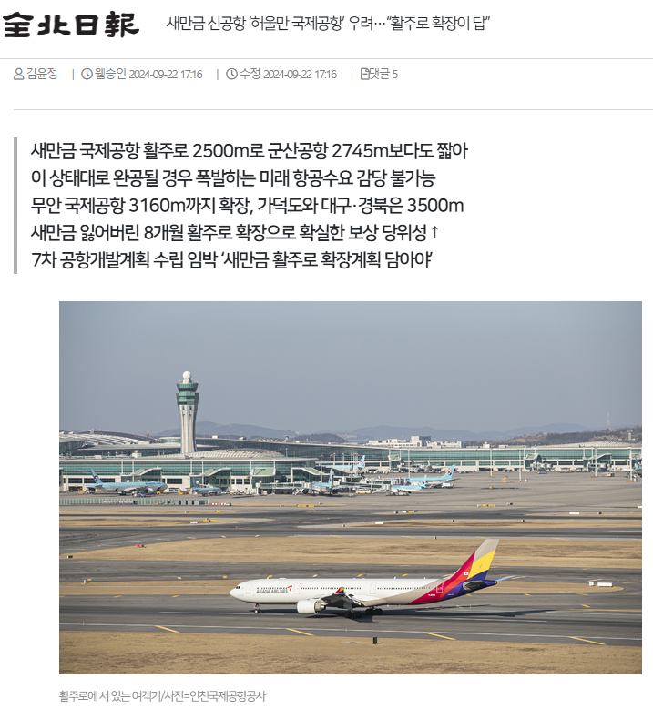 오늘 자 전북일보는 동시에 새만금 국제공항 계획상 활주로의 길이가 2,500m로 2,745m인 군산공항보다 짧다며 미래 항공수요를 위해 최소 3,200m 이상으로 활주로 길이를 늘려야 한다고 보도했습니다. 현재 상태로는 일본, 중국, 일부 동남아 국가 등 단거리 국제노선만 운행할 수 있다는 건데요. 장거리 여객기를 운행할 수 없어 공항의 경쟁력이 그만큼 줄어든다는 겁니다.