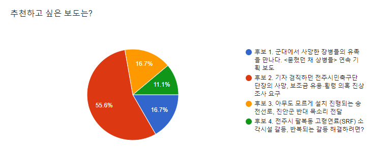 네 개의 후보 중 <기자 겸직하던 전주시민축구단 단장의 사망, 보조금 유용‧횡령 의혹 진상조사 촉구> 전북의소리 보도가 55.6%의 투표를 받아 2024년 9월의 좋은 기사로 선정되었습니다. 축하드립니다.
